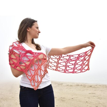 The Ripple Effect Wrap is an openwork scarf or shawl perfect for adding color and texture to your summer wardrobe while you to stay cool. The unique stitch work is made using an easy i-cord technique called Lattice Knitting. You can learn the basic technique and find more info in YouTube lessons. The net-like fabric does not use a lot of yardage; a scarf requires only a single skein. With two skeins, you can make a large wrap, ideal for the beach.