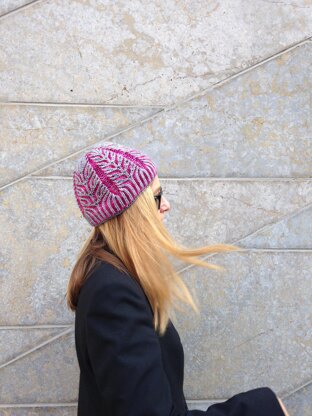 RISPEN is a female beanie worked in two-color brioche stitch. A bottom up hat featuring a botanically-inspired allover pattern of frozen trees and leafs. Details like the German twisted cast on, seamless transitions from ribbing and brioche pattern and shaping crown decreases yield a female accessory. Perfect pattern to gift yourself or to warm the ones you love.