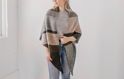 The River Grove Wrap is unique in both shape and design. This trapezoidal wrap features a patchwork design, showcasing a medley of stitches and color blocking techniques to create one unified piece. Within this pattern, you’ll explore ribbing, post stitches, and a mix of basic stitches to create unique textures.