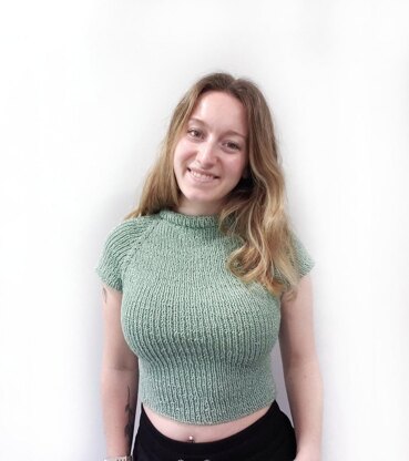 The Rizzo Tee was actually kind of a happy accident design! I had a totally different plan in mind but it evolved into this lovely tee. It gave me a bit of a 50’s Grease kind of vibe, which is why I named it the Rizzo Tee! It has a fold over collared neck and is worked top down raglan style in 1 x 1 ribbing. It is designed for short cap sleeves, but I have included instructions for making a long sleeve version as well. The tee is designed to fall at a mid crop sort of level. This is a #sizeinclusive pattern, and is designed for 4-10” of negative ease.