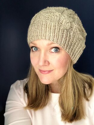 The Roaring Fork Hat is worked in the round. It features cables and a diamond design. It can be knit to fit a variety of sizes from a child to an adult. There are two options for the brim, either a fold-over or regular brim.