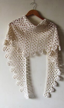 Rocio is a triangle scarf which combines simple geometric pattern and crochet lace. Finished size: wingspan 80”/200 cm, depth 18”/45 cm. Size is easily adjustable.