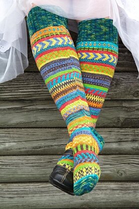 Knit from the cuff down, these luxurious and playful socks can be made using scraps from other projects or with a few favorite new colours. The sample shown was knit using 9 colourways (8 semi solid and 1 handpaint for the cuffs, heels and toes) but as few as 4 could be used effectively. I reversed the colours on each sample sock.