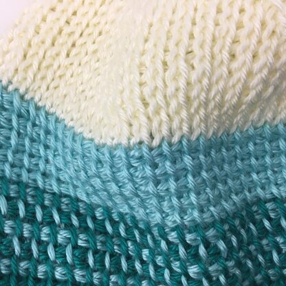 This is a super simple-to-stitch hat, using the beginning Tunisian crochet techniques of Tunisian Simple Stitch in one- and two-colors, and Tunisian Knit Stitch. It’s crocheted flat, then sewn up along one seam, and is a great use of partial skeins of yarn you might have in your stash.