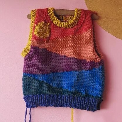 The Rolling Sunset Vest is a quick to make, statement piece inspired by glowing sunsets over rolling hills. This cropped vest can be worn over a shirt for a more formal look or on its own to make it casual. Rolling Sunset is knit bottom up, starting in rows, then in the round and finished in rows again. The cuffs and collar are picked up from the body with seaming only required on the shoulders. To avoid excess waste and bulkiness, makers should use the intarsia colour work method.