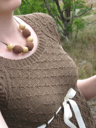 Raglan top knitted from the bottom up, first back and forth and yoke in the round. Lace and the three dimensional surface motif gives a romantic touch. Especially with the satin ribbon that’s laced up as a cute bow under the bust.