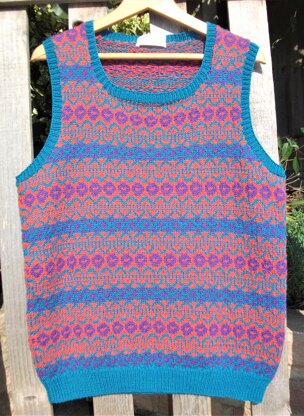 A beautiful Fair-Isle slip-over worked in stocking stitch. The Fair-Isle patterning uses 2 colours only in any one pattern row. Single ribbing completes the neat look slip-over. I chose vibrant colours for this design, but it would also look lovely in more traditional shades.