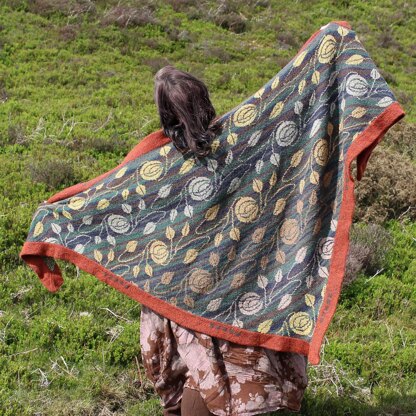 The shawl is a triangular design with a design of roses and leaves that is repeated horizontally and then vertically as you work from the bottom tip to the wide top. You may knit the small, medium or large sized version of the shawl by increasing the number of vertical pattern repeats.