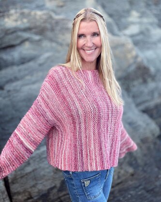 Late summer vibes ♡ Cropped sweater knitted with two strands of yarn, in sweet shades of rose pink. Combine two finer yarns, for a nice blend of your own creative choice! The sweater is a super easy knit, as body and sleeves are plain rectangles. The body is simply knitted back and forth on the needles, creating garter stitches - then mounted sideways, so the body length will be determined by the amount of sts casted on. Best of all: The width can easily be adjusted by just knitting each front/back piece longer/wider.
