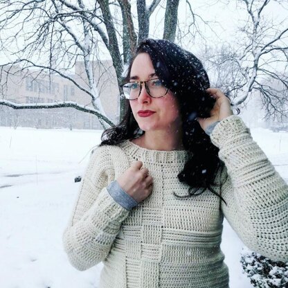 This crochet pattern is for a basket-weave illusion turtleneck or crewneck pullover sweater. It features interwoven stripes along the front, back, and sleeves. A technical project that creates a beautiful and unique sweater. There are two stripe variations offered in this pattern, and one and two color options. This pattern features a full photo tutorial with size options for S [M, L, XL].