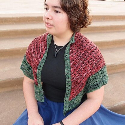 A little confection to keep your shoulders warm, Rosaura is a crescent-shaped shawl knit from the bottom up using three lace patterns and finishing with a rolled stockinette neck edge. The stitch patterns show the beautiful shadings of this variegated yarn to their best advantage, while the shape helps to keep the shawl in place without a shawl pin.