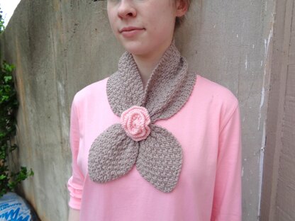 A sweet rose accents this comfortable ascot scarf with a pull-through keyhole for a stay in place style.