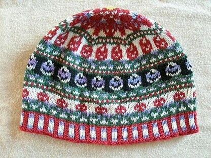 Die Mütze hat einen mehrfarbigen Bund, verschieden große und verschieden farbige Rosen und obendrauf eine große Rose
