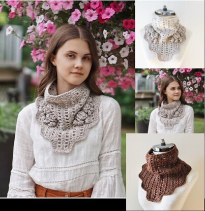 Rose Cowl Scarf has a classic floral style adding a unique touch to your wardrobe. This design is great with or without the roses for a different look. The contemporary feel of the plain design is perfect for any wardrobe. Designed by Valerie Baber of Valerie Baber Designs just for you to warm your day with elegance and style. Made with a worsted weight yarn to keep you warm and cozy in the colder days.