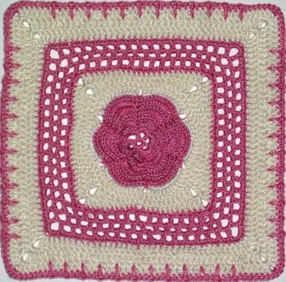 Designed especially for fingering weight yarn and works up to an 8" square. A rose in full bloom is surrounded by lovely lace filet.