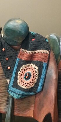 This design ( center photo) uses 3 skeins of 3 different colors of Koigu KPM and 1 skein of 1 color of a Koigu KPPPM. It is embellshed with 12 buttons and 7 beads of different sizes and colors. It could be crocheted in so many different types of fingering weight yarn, requiring 700 yds. Raid your button and bead boxes to embellsh this piece to make it one of a kind!