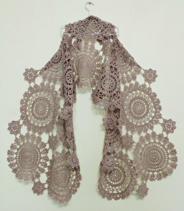 Summer crochet scarf pattern "Rozette Wrap" design includes: • Hook and yarn suggestions • Crochet symbols in standard US terms • Explanation of specified stitches • Graph charts • Written instruction • Joining diagram