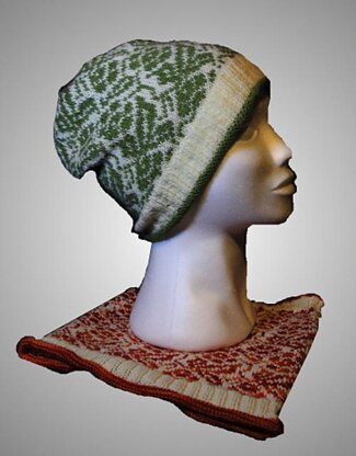 The model is knitted in the round with two solid yarns, but can be knit with one solid and one multicolored yarns also. Two multicolor with long color shift can also give a great result. The green/white is model 1 and brown/white is model 2. In this pattern you'll also find complete charts of the hat for model 1 and 2, if you prefer to follow such a description.