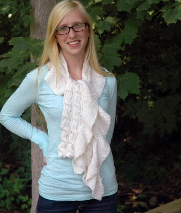 The Ruched Ruffled Scarf is and elegant scarf knit with worsted weight alpaca. It features a ruffle that utilized short rows, and a pattern stitch that is totally reversible for the main body of the scarf. The scarf is gathered or ruched by picking up stitches further down on the scarf and knitting those stitches together with the live stitches on the needle.