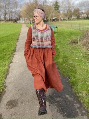 The Ruffled Check Vest is knitted using 2 yarns; soft and silky Noro is a lightly spun wool blend and is used as a main colour and Sirdar Cashmere Merino Silk is a solid colour shade, used to create the slipped stitch check pattern.