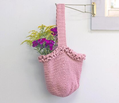 A crochet pattern for a market tote bag. This is a cute bag embellished with ruffles around the top edge.