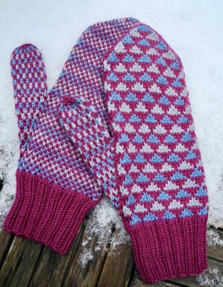 These warm mittens come in three children sizes and one adult size. They are knit in stranded stockinette stitch at a tight gauge to make them both warm and durable. Knit one pair in a different colorway for every family member!