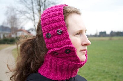 Wrapped around your head and neck, this will keep you warm – but not sweaty – on winter excursions. The yarn, a smooth and bouncy cotton/wool blend, is perfect for activewear, and as you warm up you can lower the loop around your neck for a looser fit that still warms while allowing air to circulate. If even that gets too much, just drop it down into one long loop that won’t get in the way! Adding extra buttons gives you the option of fitting it more closely around just your neck and chin.