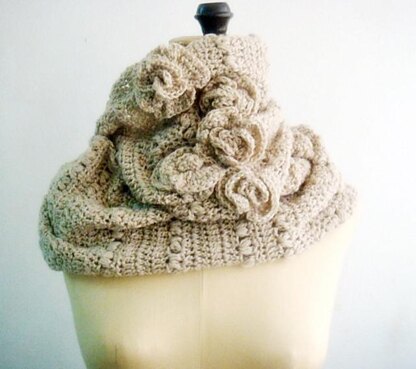 Fashionable crocheted infinity scarf with roses made with worsted weight yarn and hook H. Pattern is written in American Terms. Difficulty: Easy.