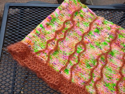 The pattern Rusty Keyhole Cowl brings together fun variegated colors of handdyed yarn with a fluffy texture of mohair yarn.