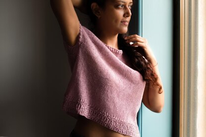 This is a simple top-down raglan sleeve pullover with about 4" [10cm] of positive ease at the bust and no waist shaping. It has a side slit and little motifs making up the hem, neck and collar edgings. These motifs also form a design element at the back and on the sleeves. Sample shown here is Size 1 with a finished bust measurement of 34" [86cm] modeled on a 32" [81cm] bust size.