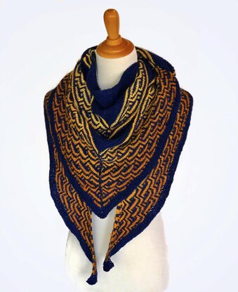The shawl construction is top-down, triangular and the instructions are both charted and written. Mosaic is fun and relatively easy as colorwork goes, given that only one color of yarn is used per row. The solid bands are worked in simple garter stitch. The Mosaic sections are perfect for a gradient yarn and contrasting colors and smooth yarn is recommended for the colorwork to be vibrant and visible.