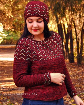 The Sagittarius Sweater is a classic circular yoked sweater, but with my own twist added to it. The theme of the #MyZodiacSweater collection is "colorwork made easy", and the Sagittarius is no exception. So, I've come up with a technique which I think you’ll find both fun and intriguing. The thin and crisp arrow motifs are not applied directly onto the fabric using a technique such as surface crochet, rather they are embedded into the fabric as you go. Each round is worked normally one after the other. The secret is a combination of front loops, back loops, and chains of various lengths. The Sagittarius is worked from the top down mainly in eSC in FLO, and is designed to be worn with -2" to +2" (-5 cm to 5 cm) of ease around the bust. The pattern provides ample customization opportunity at the waist, hip, and arms, making this sweater a perfect fit for your body and a staple in your fall/winter wardrobe.