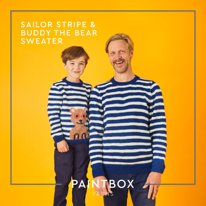 Stripes are always cool and classic - and here's a duo that will melt your heart! The Mini Me version has an intarsia bear knitted in! Knitted in Paintbox Yarns WoolMix Aran, these sweaters work up fast, and they're cosy too! Choose your colours - match to team colours, or favourite shades!