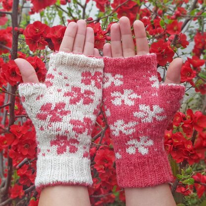 Sakura Season fingerless mittens are made with a double-knitting technique (knitting two layers at the same time). Pattern includes different knitting techniques, like: invisible CO, 2x2 ribbing, colorwork, increases, kitchener BO, but adopted for double-knitting. The result are reversible, double-layered mittens; for warmth within, caressed by warmth without.