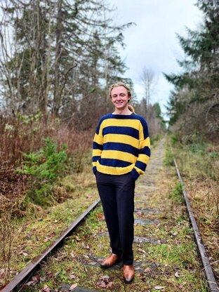 The body of the sweater is knit in the round from the bottom up to the underarm. The front and back are separated, then completed using straight needles. The collar is incorporated. The shoulders are then seamed together. Stitches are picked up and knit around the arm opening for the sleeve. The directions are written for a 7.5cm (3inch) stripe. Any width will work with this pattern as long as you stay consistent.