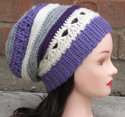 This pattern is for a cute, stripey slouchy beanie featuring a variety of textured stitches, including a special surface braid stitch, and a subtle ribbed brim. This hat has tons of texture and interesting stitches to keep you captivated as you crochet! The color possibilities for this hat are endless; use one or many colors, or use a self-striping yarn for a gradient effect! The pattern comes with easy to follow step-by-step instructions and helpful, clear photos.