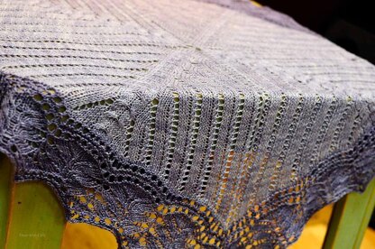 An elegant, graceful shawl, knit in the round from the center out. The square design features cables and simple lace motifs, and can also be knit at a heavier gauge to create a beautiful throw or baby blanket.