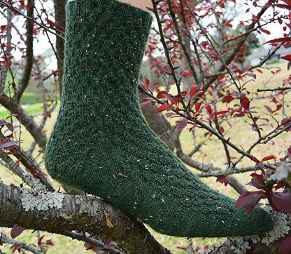 Pattern is knit in the round from the top down with a horseshoe heel (flap and gusset construction). The stitch pattern is carried down the heel. Instructions are detailed but assume you have basic knowledge of top-down sock construction including turning a heel, picking up stitches, and Kitchener stitch grafting. Includes both written and charted instructions.