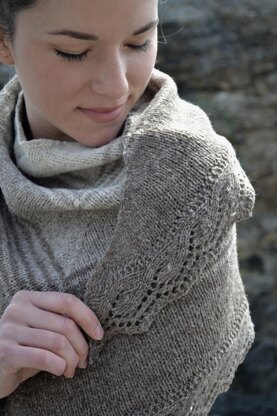This shawl, with its beautiful shifting shades and wave lace edge is inspired by the colors and sounds of the beach. It is the perfect thing to wrap around your shoulders as the winds begin to change. I adore simple shawls for comfort knitting, and love a shawl with just a touch of lace. This shawl combines all my favorite things: simple construction, with just enough interest with the addition of stripes, a touch of lace for some beauty, and a heart shape that stays easily on the shoulders without a lot of fuss.
