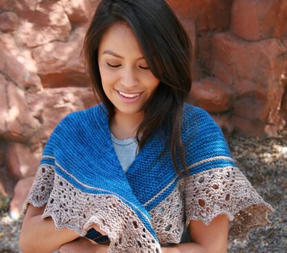 Beginning with a center neck cast on, the shawl features 2 columns of yarn-over increases, plus increases at the edges. The first section is in garter stitch, so the knitter will see fast progress.
