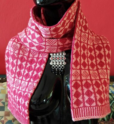 Sanquhar patterns are typically knit in two colors - often black and white – although I’ve chosen the red and pink colors for a more contemporary look. The scarf is knit in the round as a tube, and as only two colors are used on any round it makes for a relatively simple, yet interesting project. The scarf is finished by blocking the piece flat and then sewing each of the ends closed.