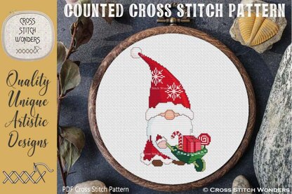 An Adorable Christmas Gnome with wheelbarrow counted cross stitch design!\nCross Stitch Pattern designed by Marcia Manning.\nDesign is 75 stitches wide by 117 stitches high.\nPDF is a COLOR counted cross stitch chart which lists suggested DMC floss colors, and includes a color picture.\n\nStitched design size is as follows:\nSize 11 count: 6.82 x 10.64 inches or 17.32 x 27.02 cm\nSize 14 count: 5.36 x 8.36 inches or 13.61 x 21.23 cm\nSize 16 count: 4.69 x 7.31 inches or 11.91 x 18.57 cm\nSize 18 count: 4.17 x 6.50 inches or 10.58 x 16.51 cm\nSize 22 count: 3.41 x 5.32 inches or 8.66 x 13.51 cm