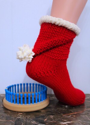 This is a cute santa hat bootie done on the 36 peg loom in the 7/16" gauge cindwood loom but a 1/2" gauge loom will work with 36 pegs. It includes a video tutorial and the bootie is done all in one piece. It uses a kiss heel, double wedge toe with a kitchener close. This is an intermediate pattern and requires minimal extra parts. Mostly buttons for the front. I used one skein of Yarn Bee Soft and Sleek. You can use scrap for the top of the bootie. I include instructions on how to adjust the pattern for other sizes with basic techniques. It helps you have already made booties or socks before using short row heel and toes. I also suggest on the booties section once past the cuff to go with what you are comfortable doing for the heel and toe and what you are comfortable closing the toe up with. Please let me know if you have any questions!! Have fun and keep on Looming!!!