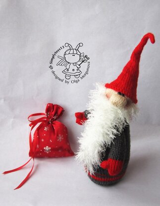 Materials needed • 4 double-pointed needles in a size suitable for the yarn weight you are using. I recommend using needles a size or two smaller than the yarn calls for, to produce a firm fabric. İ used Needles size 2 (3mm) • Cream acrylic yarn (Kartopu «Flora» (100% acrylic) for head and nose • Rad yarn for hat, mittens • The gray yarn for the body and hands • White fluffy yarn (YarnArt «TECNO » 100% polyamide or Soft eyelash yarn) for beard • Toy stuffing • Plastic eyes or 2 buttons for eyes • Yarn needle • Stitch holder • A piece of red fabric for bag • Satin ribbon 50 cm for the bag