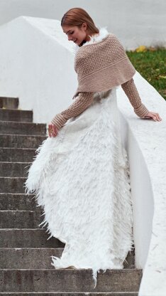 Named after the step pyramid in Egypt, I have created my own Saqqara. A stunning reversable lace pattern with triangular shapes, adorn the rectangular shawl with a shawl collar and the matching loose sleeves. Like jewelry the tucks frame the hands on the loose sleeves and divide the patterns on the shawl. Use the shawl with a shawl collar around your neck, shoulders, bust or upside down, just as you prefer, with or without the loose sleeves.