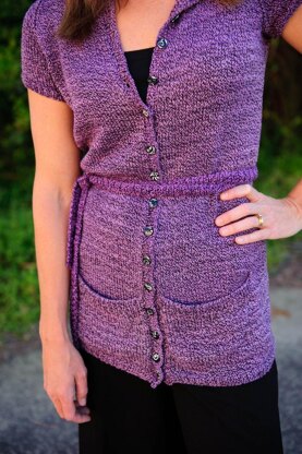 This short-sleeved boyfriend cardigan is a classic. It’s simple to knit, worked seamlessly from the bottom-up and great for beginners. Sarabeth looks great worn open, or buttoned closed and topped off with a belt. It’s shown here in size S/M worked in a loose fabric. Sweater knits up beautifully with worsted weight yarn worked at gauge, as shown in the youth version of this pattern.