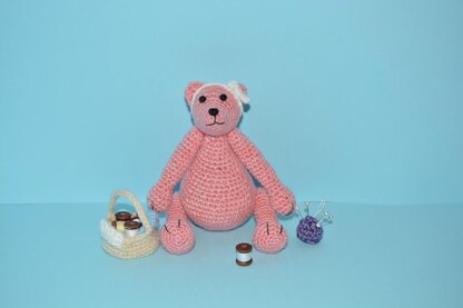 Sarah The Sewing Teddy Bear is a beautiful little teddy bear who loves to sew! Sarah has a little basket, 5 sewing thread bobbins, 2 pieces of material, and a pin cushion with pins and a needle. She also has a cute headband. This is an easier make for those with some crochet toy experience.