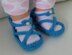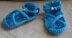 These sandals are knitted in garter stitch with two i-cord foot straps and a buttoned ankle strap.