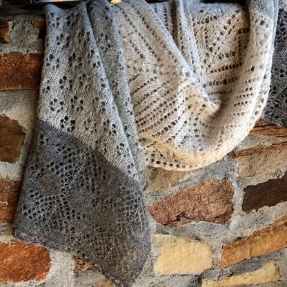 This shawl begins with a square center panel worked in the round from the center point out. The two rectangular side panels are then worked outward from this center panel. The shawl has three snowflake patterns, a large one at the center back, a smaller 6-sided motif and a large interlocking motif at the ends. The motifs are highlighted with (optional) beads that give the lace a bit of sparkle.