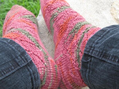 This is a toe up lace and textured sock, with a short row heel, sized to fit most ladies with an 8" circumference foot.